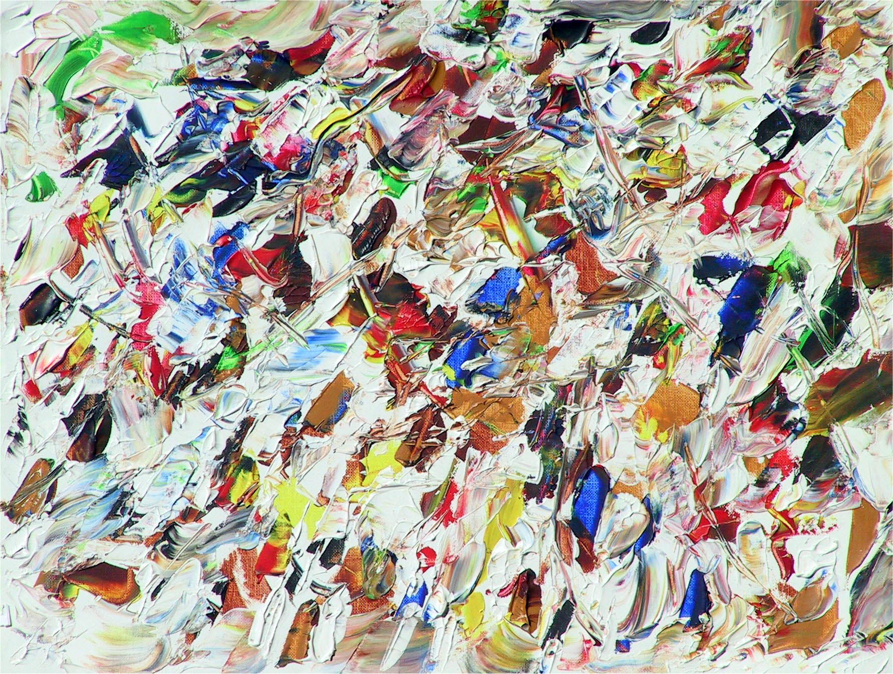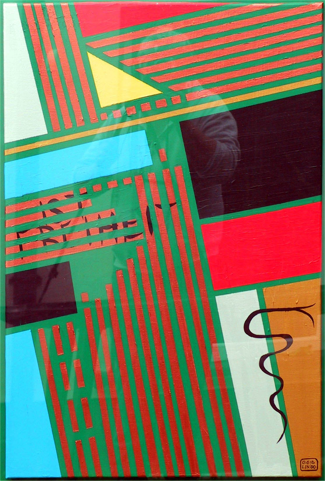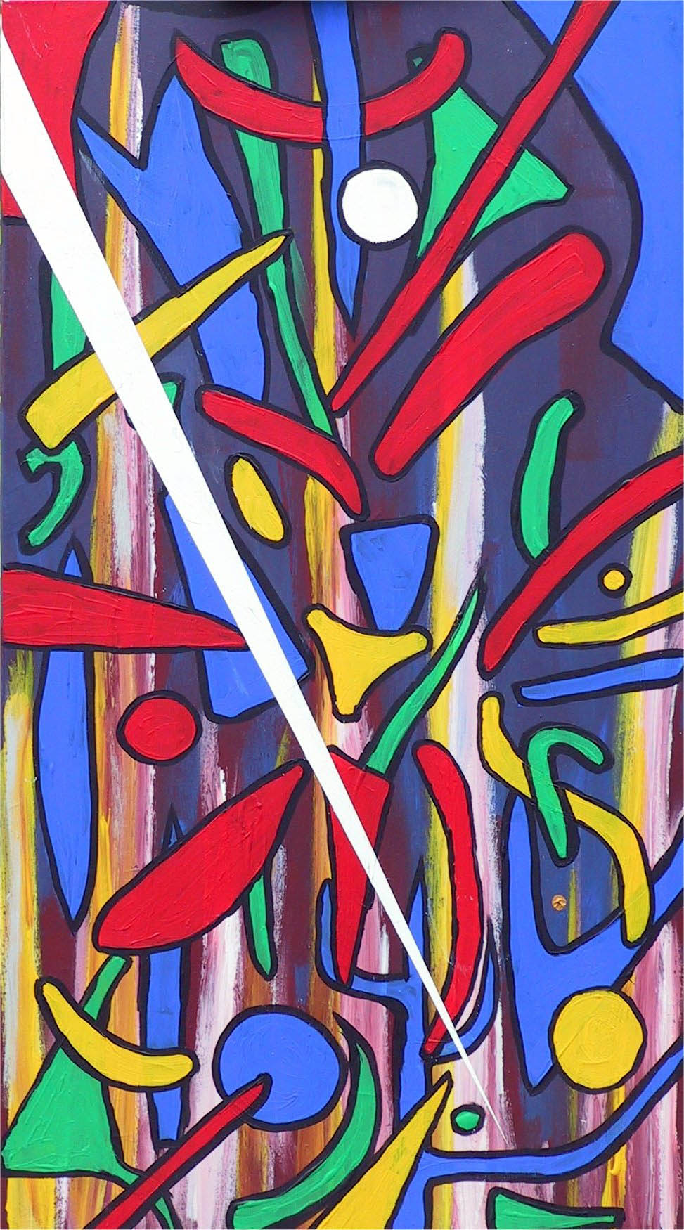 This piece is acrylic on canvas. Colours used are: Silver, Gold, Copper, Black, Blue, Red Yellow and Black. The